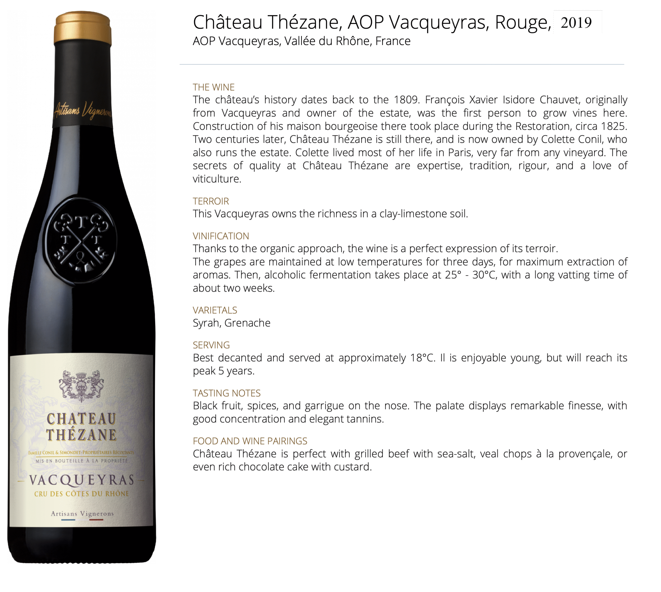 Château Thézane is a bold and expressive red wine from Vacqueyras, often called the “little brother of Châteauneuf-du-Pape.” This deep garnet wine reveals intense aromas of black cherry, licorice, and Provençal herbs. On the palate, it is full-bodied and structured, delivering layers of ripe fruit, spice, and subtle minerality. A wine that beautifully balances rustic charm with polished elegance.